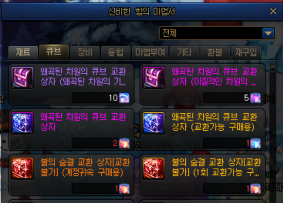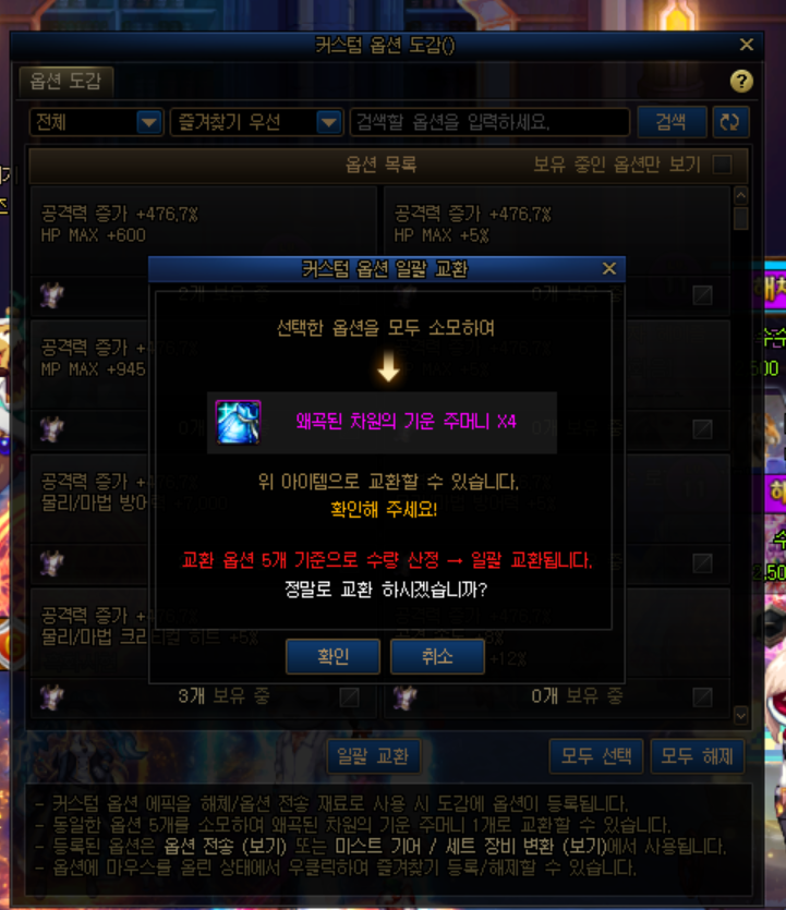 ESC눌러서 커스텀옵션도감 에 들어갑니다. 모두선택 누르고 체크박스 2개모두 선택후 일괄교환을 누르면 왜곡된 차원의 기운 주머니를 얻을수 있습니다. 그리고 남은 큐브들과 함께 마법서 큐드 탭에 들어가 모두 바꿔줍니다.