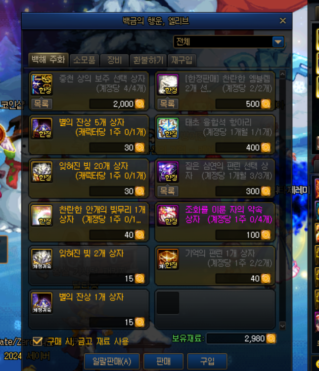 25년 1월 9일 삭제되는 아이템들이 많은데요. 백해주화 상점또한 마찬가지 입니다. 저처럼 이미 재료를 다 털었을수도 있지만 25년 1월 1일 ~ 2일 짙편린 상자 와 태초 융합성 항아리 , 기억의 편린 상자를 추가 구매할수잇을것으로 보여집니다. 점검끝나면 바로 구매하시는걸 추천드립니다. 1일에 다처리하는게 좋은데 2일까지 하는건 혹시 백해주화가 모자라서 모아야할수도 있어서 2일까지 로 잡아놓습니다.^^