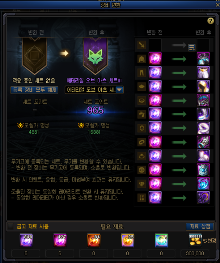 - 중천 장비: 레어 7세트 + 견습 여우 유니크 4세트