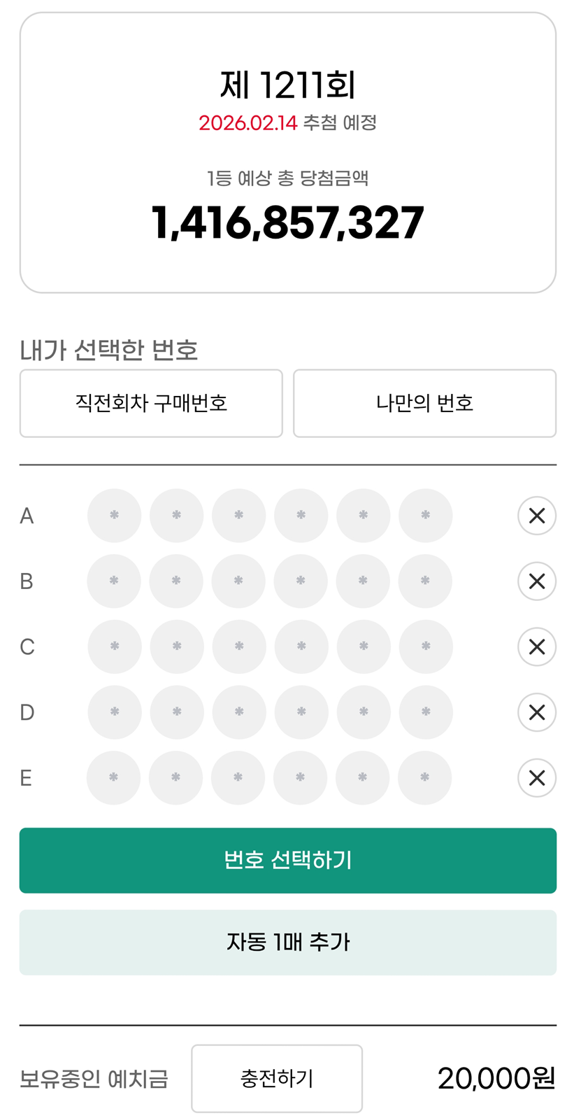 - 자동 선택: '자동 1매' 버튼을 누르면 끝.