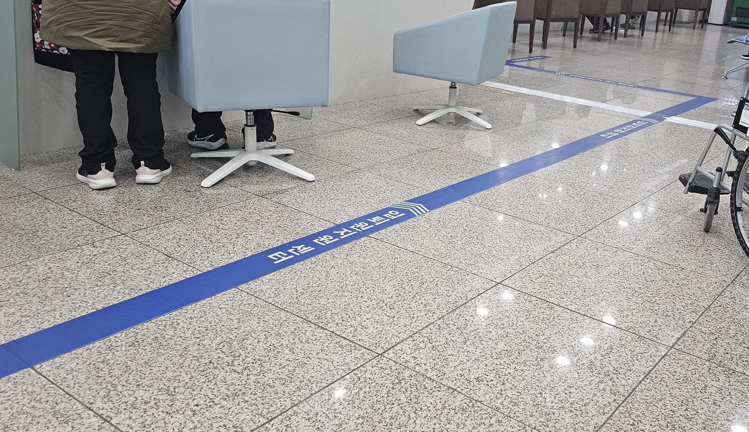 - 바닥의 파란선을 따라 이동해 (퇴원약 받는곳) 문진표 제출 및 추가 질문 응답