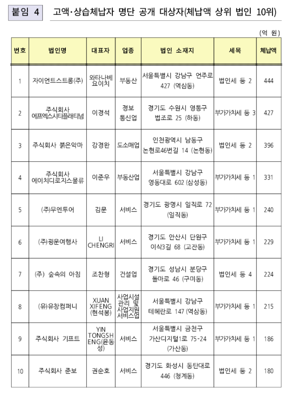 - 법인 체납자 현황: 법인 중에서는 부동산 임대업을 운영하는 자이언트스트롱㈜이 법인세 등 444억 원을 체납하여 최고액을 기록했습니다. 대표자인 와타나베 요이치의 인적 사항도 함께 공개되었습니다.