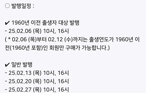🔹 2월 6일(목)부터 2월 12일(수)까지는 1960년 이전(1960년 포함) 출생자만 구매 가능