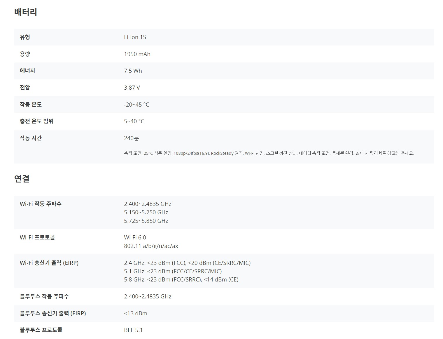 하나의 배터리로 최대 4시간[3]까지 사용이 가능하며, 영하 20도에서도 최대 3.6시간 촬영할 수 있어 추운 환경에서도 안정적으로 사용할 수 있습니다.