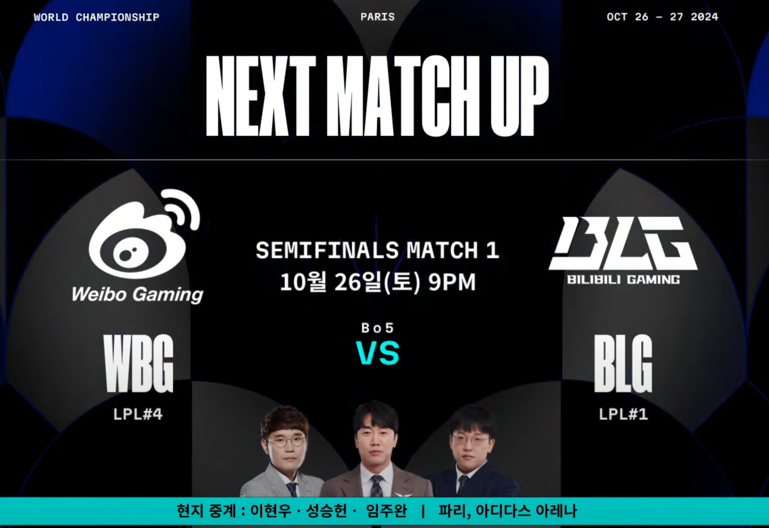 - 4강 1경기: 10월 26일 토요일 21:00 ( BLG vs WBG )